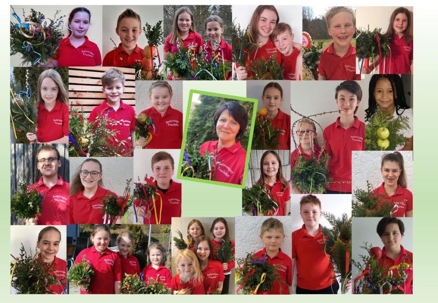 Am Freitag, den 2. April trafen sich dann alle zur Onlinekonferenz. Jeder werkelte fleißig an seiner Osterkerze. Schon nach einer Stunde konnten die meisten stolz ihr Werk in die Kamera halten. Alle Dirndl und Buam machten noch ein Foto, aus dem eine schöne Collage entstand und freuten sich, wieder einmal etwas gemeinsam unternommen zu haben. So wird es wohl nicht das letzte Projekt dieser Art bleiben.